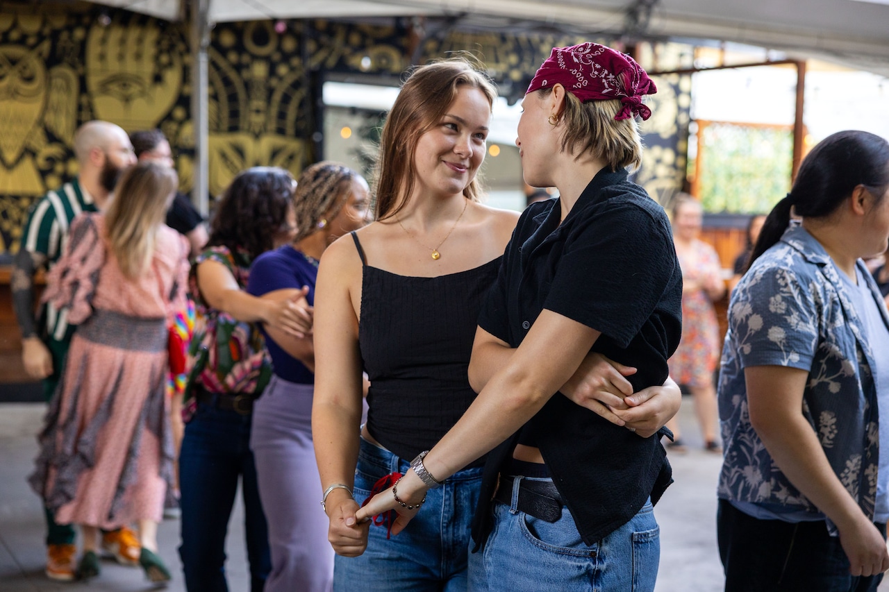 Sanura Dance offers queer salsa and bachata classes in London for "everyone who identifies as FLINTA, LGBTQ+, and feminists". At their lessons, "everyone learns to lead and follow, transcending gender norms and fostering an inclusive dance environment."